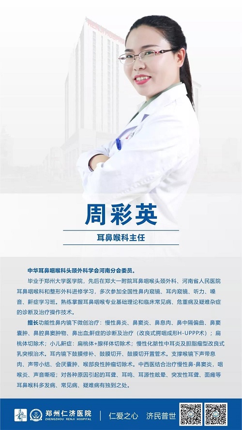 从0到百余人,快速递增的门诊量,是耳鼻喉科专家声名远播 直接的写照,尤其是科主任周彩英,近20年的从医经历,让她对各种耳鼻喉常见病、多发病等拥有丰富的临床经验,更对疑难病例、高难度疾病的治疗有独到之处。