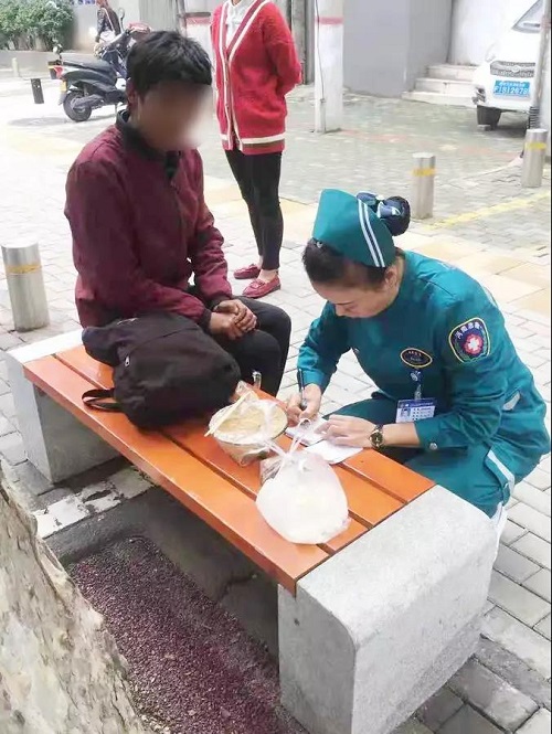 发现这名男子即将晕倒,立即搀扶其就近坐到休息凳上。准备与其交流时,发现嗓子沙哑说不出来话。与刘焱护士长一同出来的工作人员马上送来了温水,随即找来了纸和笔,方便与男子进行沟通。
