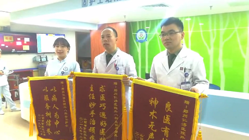 为了感谢医护给予的无微不至的照顾,还在住院时,就为董其强主任、李胜军医生以及全科医护送来了三面锦旗。