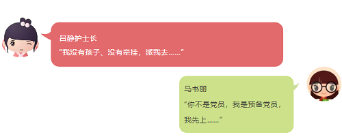 在请战的过程中,同为护理人的吕静和马书丽之间的这样一组对话,让我们的心久久不能平静。面对即将奔赴隔离点儿的一线,因为马书丽家里有孩子,不忍心让其前往一线: