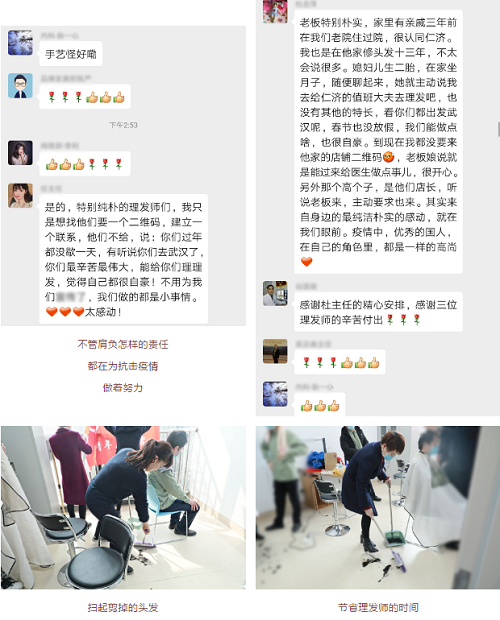 据了解,理发店负责人的亲戚三年前在北院区住过院,很认可仁济。得知理发成为了医护人员的难题后,他们主动要求前来,说,“你们过年都没有休息一天,又听说你们去武汉驰援了,你们 辛苦 伟大,能给你们理理发,觉得自己都很自豪,我们做的都是小事情。”店里的员工得知后,也纷纷主动要求加入。