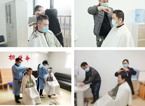 在隔离点儿的大厅,一把椅子、一套工具、一瓶酒精,就组成了一个临时理发店。郑超穿着一次性雨衣,戴着口罩,认真细致地挨个理发,让12名男同胞焕然一新,以饱满的精神面貌投入到工作中去。