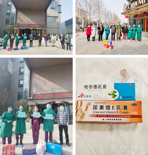 考虑到,驻守人员长时间带护目镜、口罩和防护手套,脸部皮肤敏感容易发痒、红肿,双手的皮肤容易干裂,显微整形美容中心的海莉副主任和申艳梅医生贴心的为其送来药膏,并指导如何使用,无微不至的守护着驻守的人员。