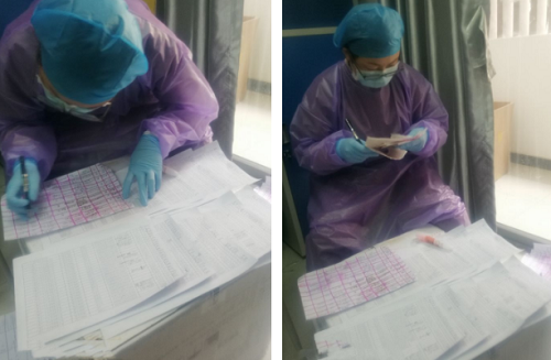 由于办公的条件太过艰苦,他们为了精准的统计每一个病人的信息,把凳子和纸箱子当成临时桌子,进行着认真详细的统计。看着他们认真专注的样子、长时间蹲着的状态,让500余名仁济家人心疼万分。