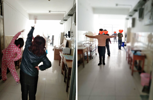 为了调节病人的情绪、增加身体锻炼的机会,3月5日早上,医疗队成员化身体育老师,将病房走廊变成广场,带领病友们做起了广播体操。
