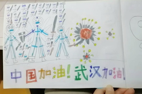 为了感谢志愿者和安保师傅的无私奉献,刘焱队长精心制作了赞美卡,赠送给了她们。期间,医疗队也收到了志愿者的孩子用心画的“中国加油、武汉加油和穿着防护服的医护”的一幅画。