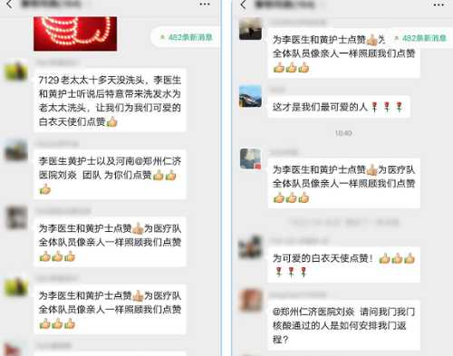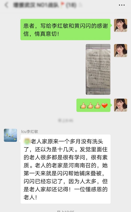 河南郑州仁济医院医疗队的刘焱队长说:“武汉是一座英雄的城市,武汉人是 懂感恩的人,他们总是不停感恩和感谢。我们病区,志愿者和安保小哥对我们的工作特别支持,他们总是主动提供帮助;病区的爷爷奶奶们自觉遵守各种病区规定高度配合治疗,对我们非常关爱,帮助我们维护秩序,不愿意给我们添麻烦,他们把我们当成自己的孩子。身体康复比较好的病友积极报名做志愿者,为楼层的病友服务,楼上楼下奔忙。”