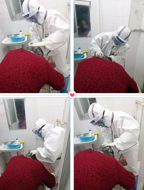 靳奶奶听说了他们的来意,激动的手足无措,她说“我头发很脏,我一个多月都没有洗头了,不能让你们洗,我不洗了吧,太不好意思了”,黄闪闪护目镜里那双唯一能被看到的大眼睛笑的弯弯的,告诉奶奶:“靳奶奶,头发洗干净了心情就好了,心情好对康复有好处的,我在家经常给奶奶洗头洗脚的,特别熟练,您放心吧!”李红敏医生笑着告诉奶奶:“洗发水还是您送我的呢,我们用您的洗发水帮您洗头发。”