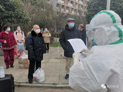 3月11日,我们10点接到通知下楼排队上车。大家拿着自己的东西,纷纷与医疗队的队员们再见,来到门外等候,工作人员点名核实身份,按各区、各街道依次离开。