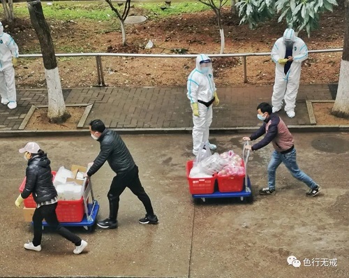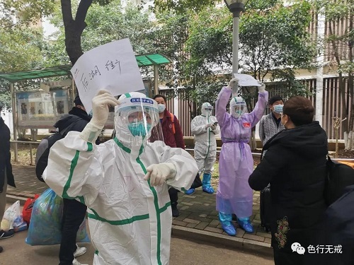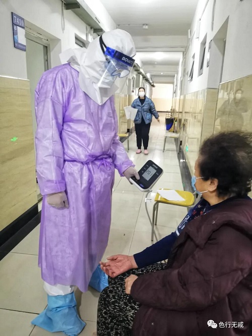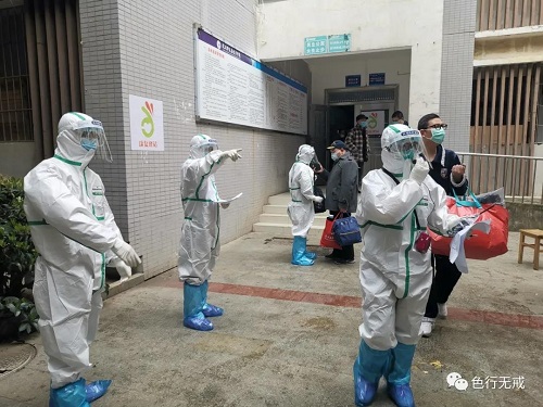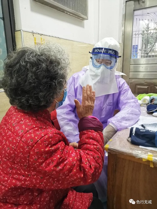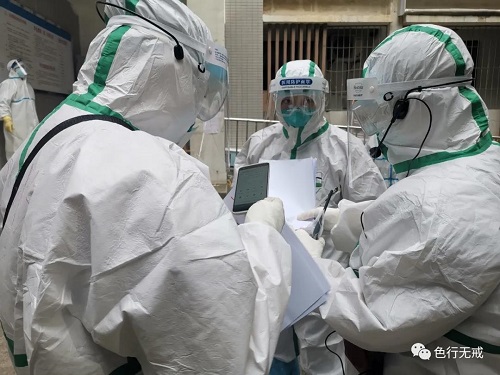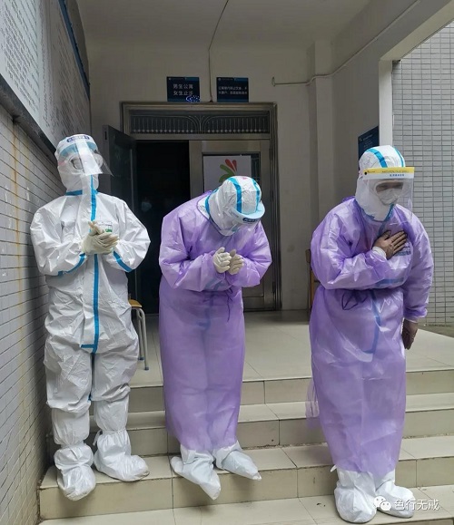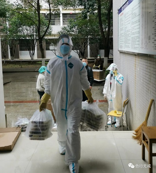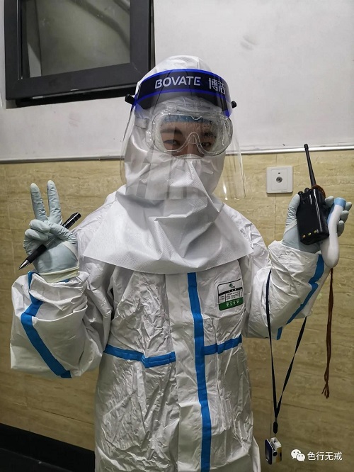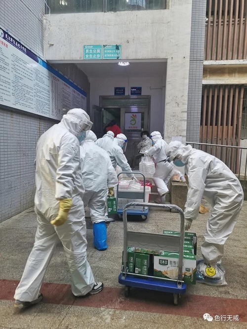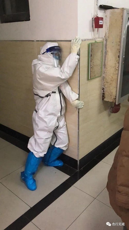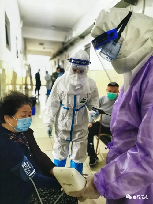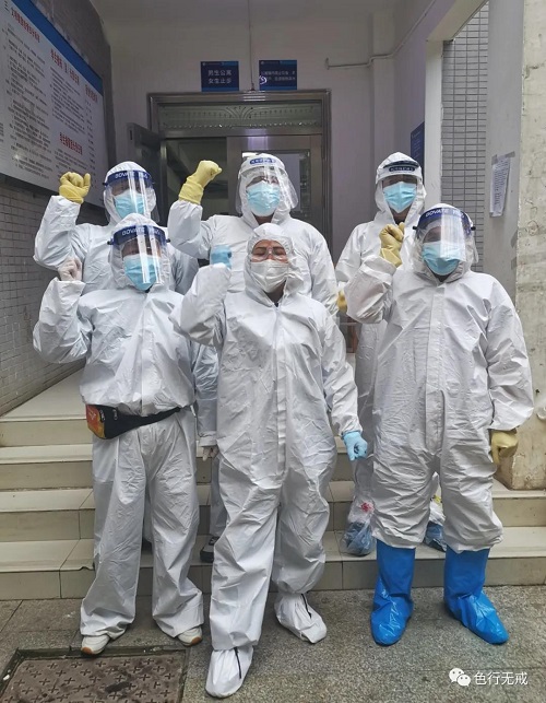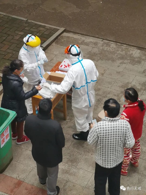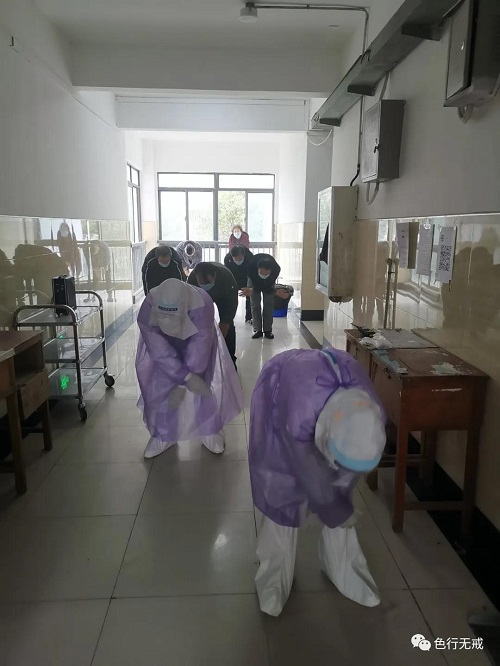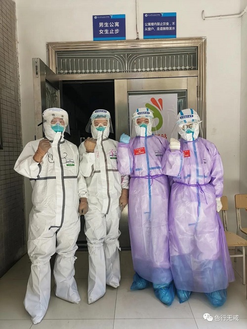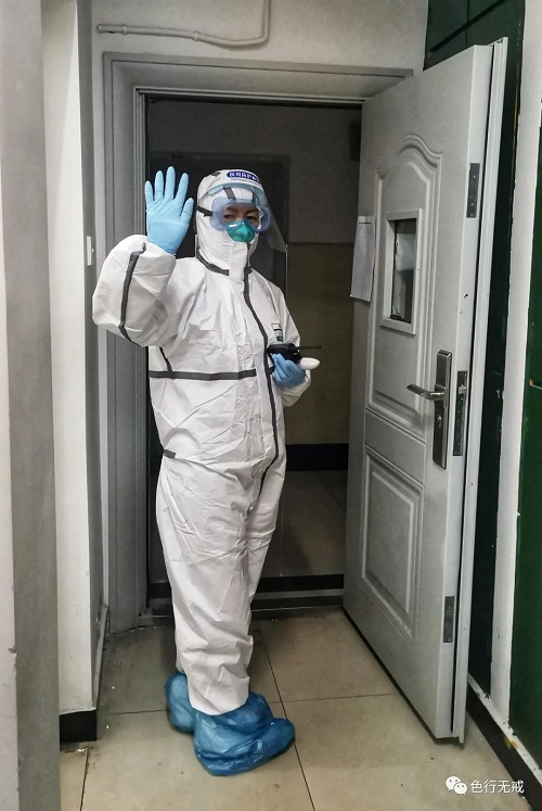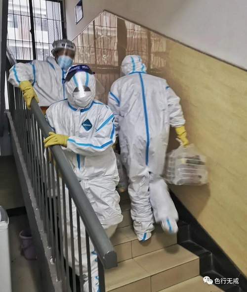 平时徒步上6楼都会感觉困难,更别说穿着厚厚的防护服了。从1楼到6楼,她们把中药全部放送完毕后,累的大口大口的喘着气,但她们从不喊苦,从不喊累。