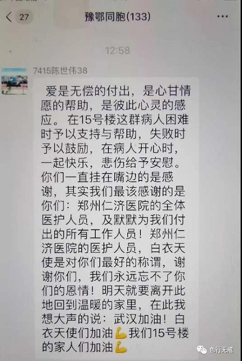 3月10日,我和一些病友接到通知,第二批离开观察区回家,大家很高兴,纷纷清理东西,在“豫鄂同胞微信群”里,大家对河南郑州仁济医院的医疗队给予了很高的评价。