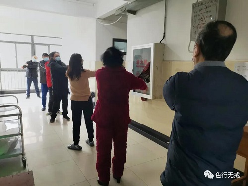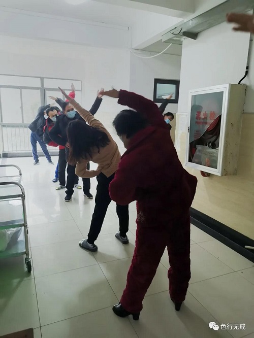 每天早上10点,病友里志愿者和医护人员,带领大家一起唱国歌、做保健操和氧肺操,活跃了驿站的隔离生活。