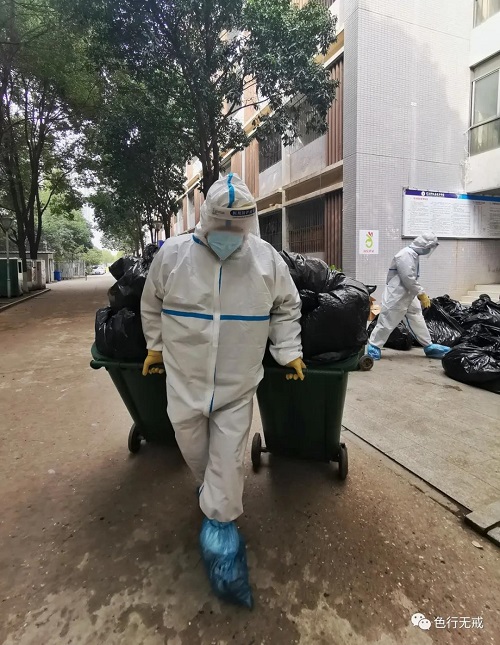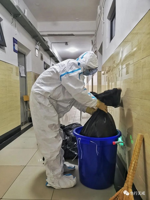 志愿者中,有工人、学生和退休人员,他们为观察区送饭、清垃圾、消毒和值班。