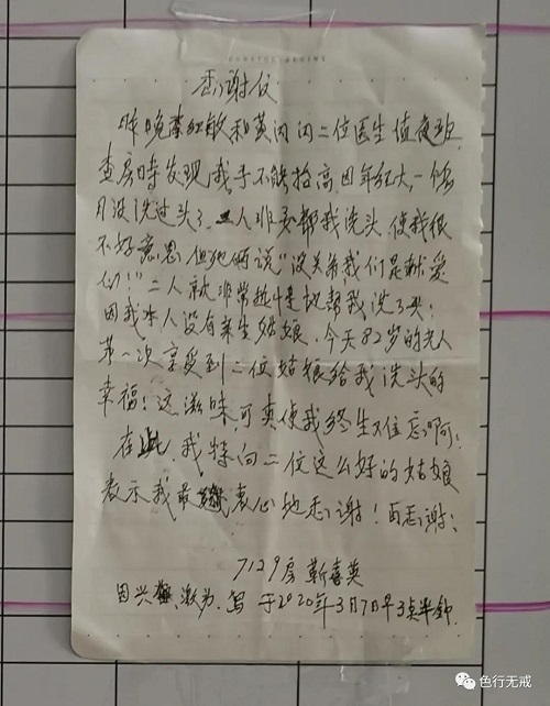 第二天,老太太给医疗队写了一封表扬信,把两位医护人员当自己的女儿,充满幸福感。