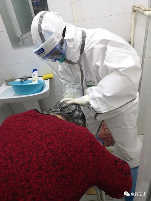 李主任(李红敏医生)发现有一位82岁老太太,有肩周炎,手抬不起来,有一个月没有洗头了,看到这情景,她和其他医护带着洗头膏,打水的打水,洗头的洗头,很快给老太太收拾干净了。