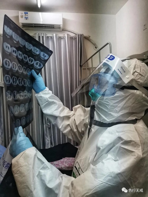 有一天,我很不舒服,头晕、血压也很高,我给李主任(李红敏医生)说了一下。晚上她来到我的房间,寻问病情,给我量血压、看我出院时拍的CT片,告诉我不要紧张,安心观察,对我进行心理疏导。