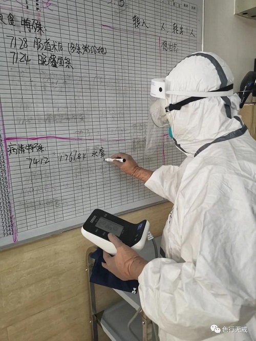 这个医疗团队8人,却要管理200余人,班次是一轮六个小时,每班两个人,那么就意味着每天他们中有一组,一天要工作十二个小时。每天进行三次查房,上午、下午和晚上,主要是给大家做血氧饱和度和心律、血压和体温检查,晚上主要对有异常的病人进行重点观察。好在大家都能吃苦耐劳,一起努力克服种种困难。
