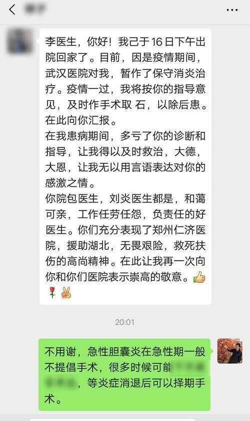 你院包医生、刘炎医生(刘焱队长)都是和蔼可亲、工作任劳任怨、负责任的好医生。你们充分表现了郑州仁济医院援助湖北、无畏艰险、救死扶伤的高尚精神。在此让我再一次向你和你们医院表示崇高的敬意。