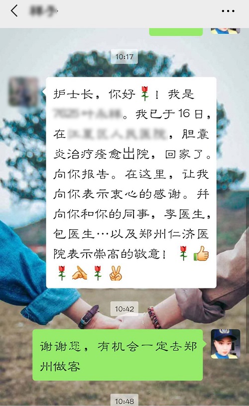 护士长,你好!我是7625的叶先生。我已于16日,胆囊炎治疗痊愈出院回家了,向你报告这个好消息。在这里,让我向你表示衷心的感谢,拜向你和你的同事,李医生、包医生……以及郑州仁济医院,表示崇高的敬意!