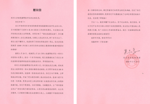 同时,我们也收到了来自远东宏信副总裁、远东宏信医院集团总经理吴志军的《慰问信》。疫情面前,你们以“苟利国家生死以”的信念践行着医者使命,以责任担当彰显医者情怀,也让远东精神、仁济精神闪耀在抗击疫情的火线上。