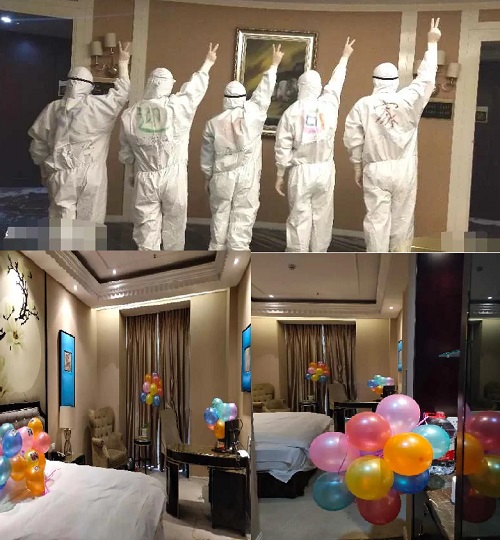 简短的欢迎仪式后,医疗队成员乘车前往由郑州仁济医院驻守的管城区集中隔离点儿,进行14天的观察和休整后,重新投入到下一阶段的工作中。驻守在隔离点儿里的仁济家人,早已准备好了一切,在防护服的背上写上了“欢迎回家”,并将入住的房间装扮的温暖温馨。