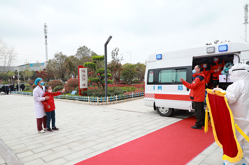 在南院区门诊广场举行的欢迎仪式上,区委组织部部长刘宁、郑州市管城区人大常委会副主任李蝴蝶、区政协副主席李雪宁、郑州市商都新区管委会副主任巴姝芳、郑州市管城区卫健委主任邢惠君、郑州市金岱产业集聚区管委会副主任杨荣军以及民政部国家康复医院名誉院长、矫形骨科主任国际肢体畸形矫正学会中国部主席、中国骨科医师协会外固定与肢体重建委员会主委秦泗河教授,郑州大展红旗体验中心党建书记宋书峰、院委领导班子等莅临欢迎仪式,郑州仁济医院全体员工列队欢迎逆行的家人回家。