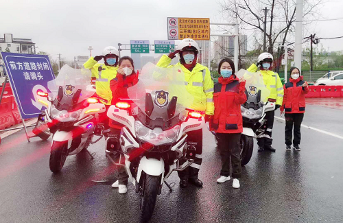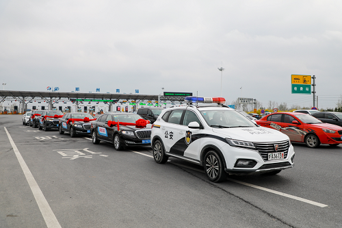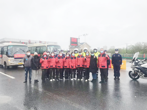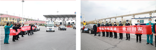 在郑州南站的高速口,警车、红旗车队一字型路边排开,用 高礼遇致敬医疗队,欢迎9位英雄回家!郑州仁济医院党支部、工会更选派代表,在迈入郑州市区 步的高速路口迎接英雄凯旋。