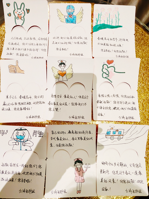 医疗队的成员,还收到了写着 美话语的赞美卡,赞美卡上有用心画上的点赞、比心、急救车以及长着翅膀的白衣天使等可爱的卡通画,是隔离点儿的家人向英雄们表达敬意的方式!