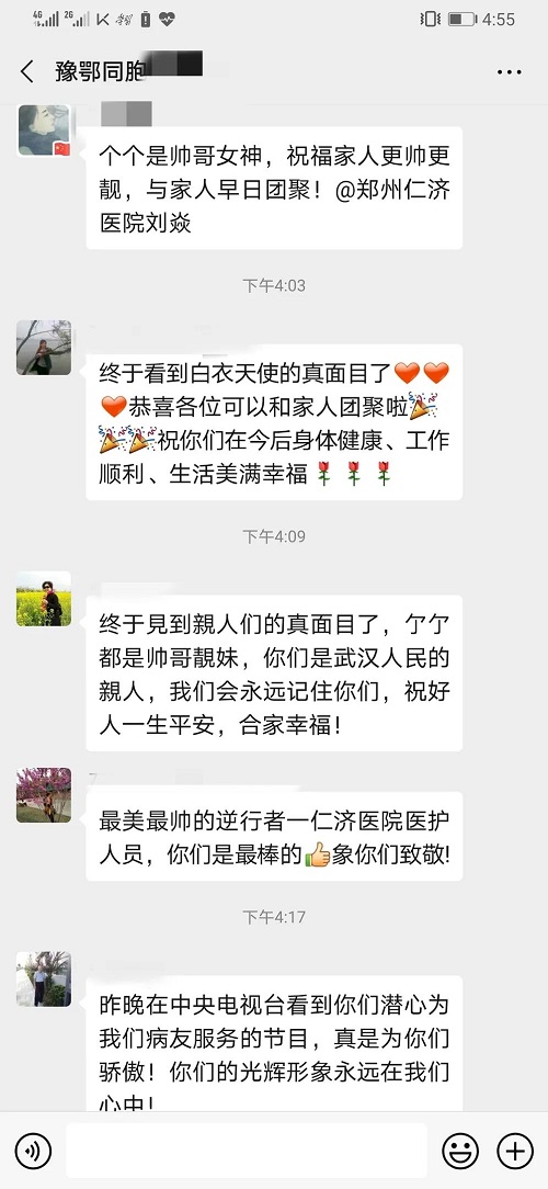 援鄂期间,医疗队为了更好服务“确诊病人后续观察治疗点儿”里病友建立的微信群,一直没有解散。当群里的武汉人民得知“医疗队解除隔离,全部平安”时,再一次沸腾起来了,纷纷表示,“这一次,终于看清了为他们拼过命的医护人员的面容”。