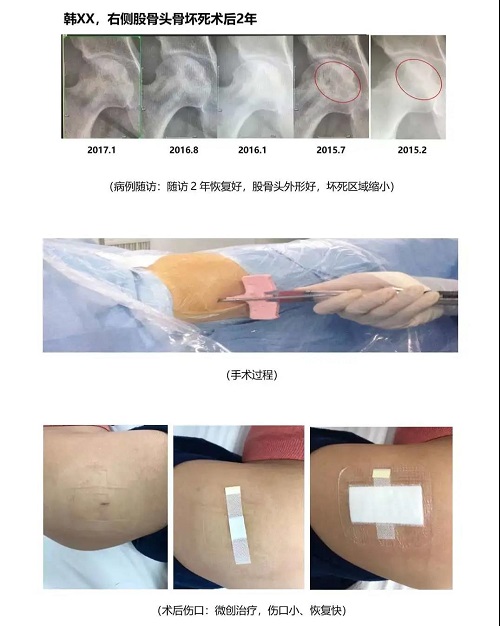 基于这样的理论基础,王鑫教授所在的301医院团队研制出一套股骨头坏死微创保髋治疗方案,自2015年开始累计治疗千余例早中期患者,术后随访均取得了较满意的效果,髋关节功能恢复良好,股骨头头外形完整,坏死面积缩小。由于该手术方法给早中期患者创造了新的治疗选择,避免了直接进入关节置换的 终方案,且为微创治疗,创伤小,恢复快,很快得到了广大老百姓的认可。
