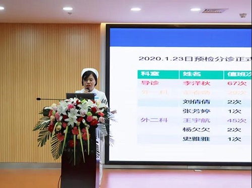 首先,我院驰援武汉医疗队队长刘焱讲述了他们在江岸区隔离病区的抗疫故事。如同回到了没有硝烟的战场,回到了 艰难的抗疫时期,刘焱护士长饱含深情与无限感慨的讲述,感动了在场的所有人。刘焱护士长回忆起 天抵达武汉,连夜奋战,仅仅12小时就规整开放隔离床位200多张,次日中午就开始收治病患。她还分享了其他8位医疗队员带给她的鼓舞和感触,那一个个闪着光芒的名字和事迹回响在报告厅内,为我们带来了宝贵的精神财富。与会人员听着报告,忍不住红了眼眶。
