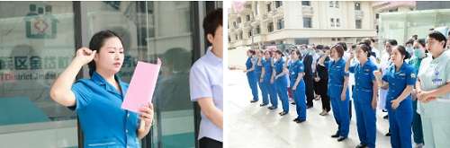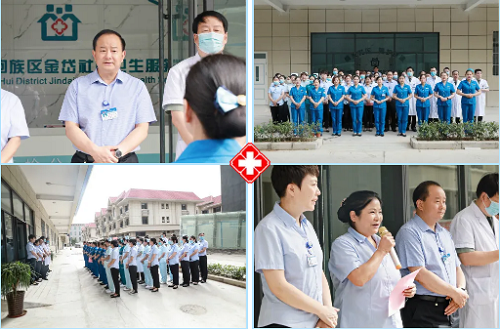 “我宣誓:忠于基层医疗卫生事业,恪尽职守,不忘初心,爱岗敬业,奋力前行。我们将全身心的投入到以人的健康为中心的基层医疗卫生服务事业中,为社区居民提供全生命周期的健康管理服务。”在郑州仁济医院马书丽护士长的带领下金岱社区服务中心医护人员进行了庄严的宣誓。